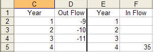 =IRR(D2:F5,0.1), which yields the wrong result because it implies there are 8 cash flows (-9, 1, -10, 2, -11, 3, 4, and finally, 35.