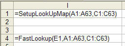 Fast EncodingThis technique initializes a data structure to facilitate a direct lookup of the the character being encoded. It does this by putting the code corresponding to a particular character into an array location given by the ASCII code of the character. For example, consider the character A. Its ASCII code is 41. Hence the array element 41 contains the code corresponding to the letter A. Consequently, to find the code corresponding to A, all one needs to do is array(ASC("A")) This technique bends Excel's rules of how a function is supposed to work. The SetupLookupMap function actually initializes a global table that is used by the FastLookup function for the actual lookup. To ensure that Excel calls the LookupMap function both when the string to be encoded changes and when the encoding map changes, the encoding map is passed to the function in the 2nd and 3rd arguments; however, the LookupVals function really uses only first argument. This set of functions is used as shown below.