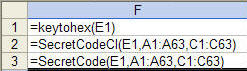 Hex codesThe function KeyToHex simply converts the string in E1 into its hex equivalent. Public Function KeyToHex(ByVal sKey As String) As String