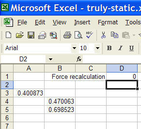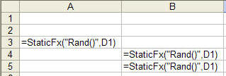 Note that the actual function, RAND() is passed as a string argument to StaticFx. The control cell, D1, is the 2nd argument.