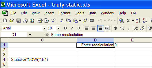 Similarly, in the other worksheet where the the cell contains the date and time, suppose C4 contains the static time and E1 controls when the value should change. The formulas are shown in Figure 2. Again, the actual function, DATE() is passed as a string argument to the StaticFx function and the control cell is the 2nd argument.