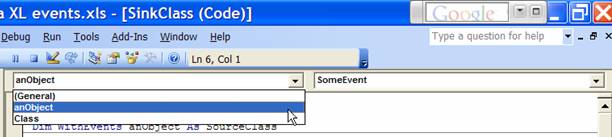 Note the use of the WithEvents keyword. Once the variable is declared correctly, the dropdown box at the top of the programming pane will list anObject together with the default choices of (General) and Class. See Figure 1.