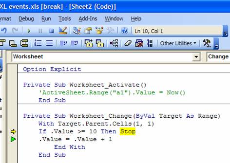 The yellow arrow indicates where the code currently is. The green triangle indicates the line that resulted in the last call to some procedure. Note that it is the .Value=.Value+1 line. Effectively, by changing the value in cell A1 the code caused Excel to trigger the Worksheet_Change event again. That happened repeatedly until the IF statement interrupted the process.