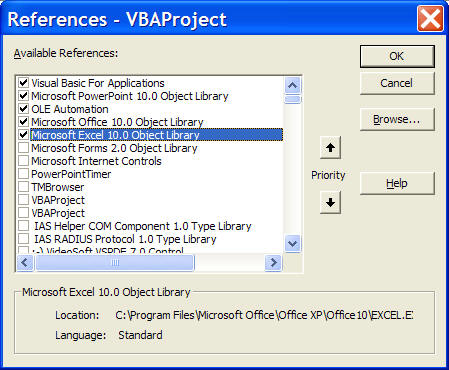 Of course, to use the above code one must set a reference to the Excel Object library as shown in Figure 4.  And, that, in itself is a clue on one possible way to avoid the problem!  We will see a solution based on not setting a reference to the library a little later.