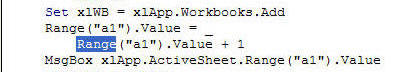 Ensure that every property / method / object within the automated application is referenced through -- and only through -- an explicit variable declared in the calling program.  That will ensure that there is no behind-the-scene direct reference from the calling program to the automated application.  To use this method with the code in Figure 3 the correct approach is shown in Figure 5.  The offending statement (in red in Figure 3) is replaced by the statement in green in Figure 5.