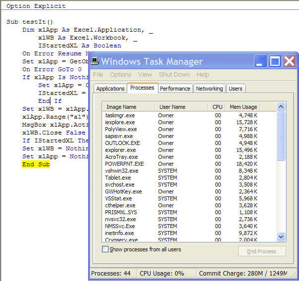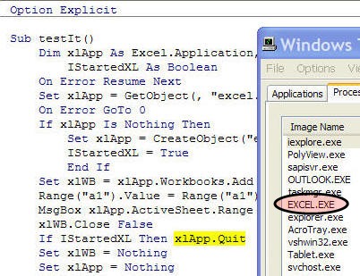 In Figure 1, just prior to the execution of the xlApp.Quit statement, the Windows Task Manager window shows that the EXCEL.EXE process is running.