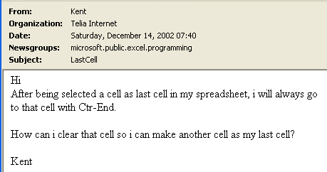 It's Saturday afternoon in Sweden and Kent is stuck with an Excel related problem.  He checks the help in Excel but doesn't find an answer.  It's the weekend and he is at home so he can't ask one of his work colleagues.  He could check with the local help line.  But that could cost money and, in any case, it doesn't operate on weekends.  Where does he find the answer?  With a quick post on one of the bulletin boards (also known as newsgroups in the language of the Internet) in cyberspace.