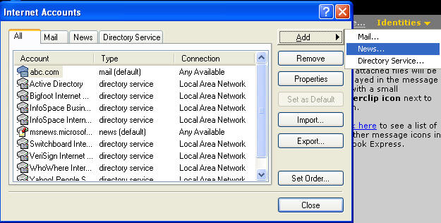 First, one must decide how to identify oneself on the news server.  Second, one must identify which news server to connect to.  In Outlook Express, a wizard guides us through the process.