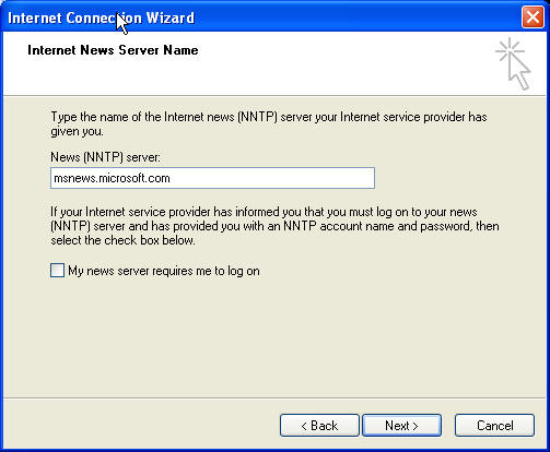 Now, we need to tell the program which news server we wish to connect to (which virtual room we wish to enter).  Type in the name of the news server.  For Microsoft sponsored newsgroups, use msnews.microsoft.com.  Leave the 'My news server requires me to log on' box unchecked.