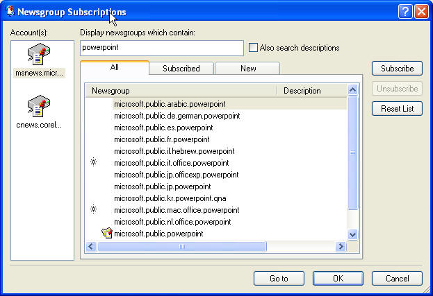This will bring up the Newsgroup Subscriptions dialog box.  Select the All tab.  You'll see a list of all the newsgroups available on the server.  While it is always possible to scroll through the hundreds, or thousands, or groups, enter a 'search' term to simplify the process.  In the example on the right, the list is restricted to all the groups that contain powerpoint in their name.