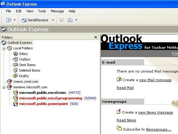 In the left pane of the Outlook Express main window, the news server and the subscribed group are now shown.
