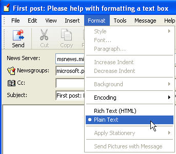 Remember that unless you know otherwise, good Internet etiquette (also called netiquette) is to use Plain Text for newsgroup messages.