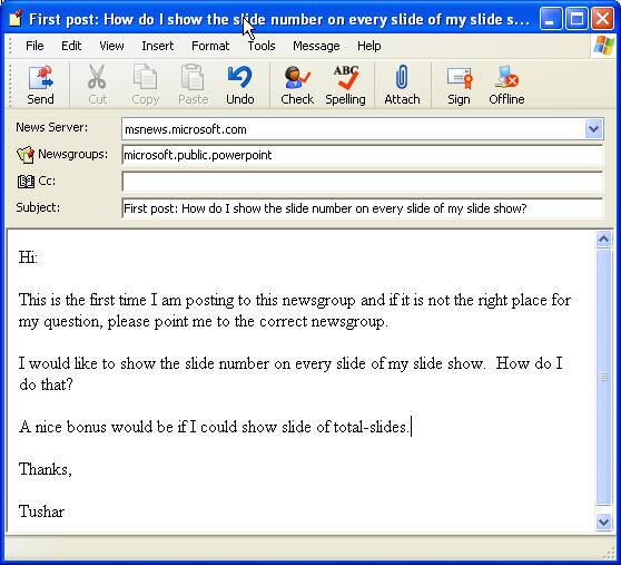 Please make sure that the format of the message is set to Plain Text.  While the newsreader program might offer other choices, such as MIME or Rich Text (or HTML), in many groups it is not considered polite to use anything other than plain text.  Similarly, unless you know for sure that it is acceptable, do not add an attachment.  For both performance and security reasons, many people do not like to -- and will not -- download files attached to messages.  To make friends fast, stick to polite plain-text messages without attachments.