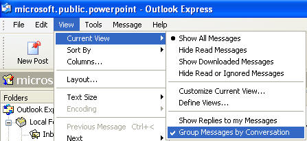 A common problem for people who are new to Outlook Express is that messages seem to disappear.  This happens because the program's default configuration is set to hide messages that have been read.