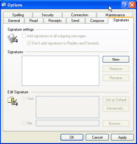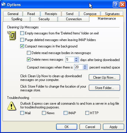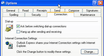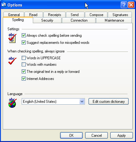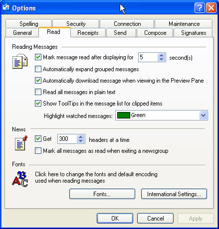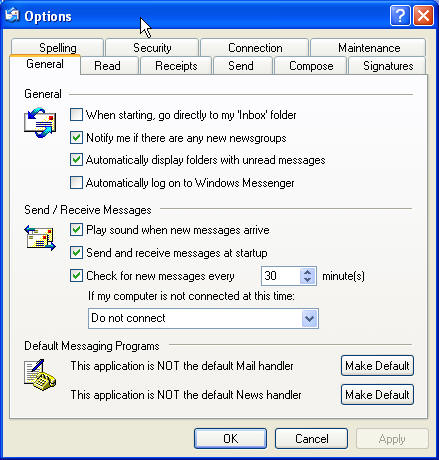 In the Tools | Options... dialog box, there are many options that allow for personalization of the Outlook Express environment.  Those below are ones that appeal to me.  As you become familiar with the program, you may want to explore on your own.  Just remember not to hold me responsible for what happens to your computer!