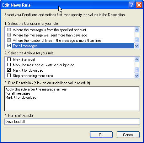 We will set up a few rules so that OE organizes messages to make our life easier.  This requires three rules for OE to manage incoming newsgroup messages..  The three rules are: