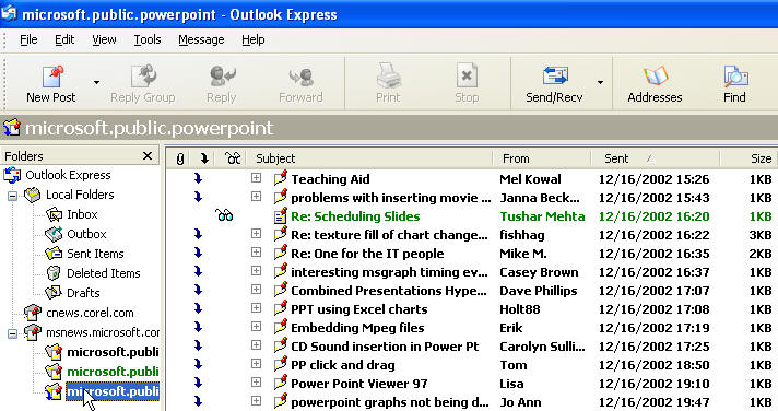 The process of connecting to a news server, subscribing to a newsgroup, posting a question, and reading the responses is documented below.  Also below are tips on how to effectively use the Outlook Express program to quickly find answers to your questions.  The screen shots apply to version 6 of the program.  Depending on the version of the program you are using (or if you are using a different program), the display and the dialog boxes may look different.  However, the concepts and necessary steps will remain the same.