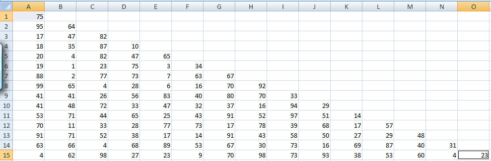 Now, copy the last row into some other row that has 15 empty rows above it. I chose row 35. Then, in A34 enter the formula =MAX(A35:B35)+A14 Copy this up column A to A21:A33 and then copy A21:A34 to B:O. One could clean up the cells so that there is only one leftmost cell in row 21, 2 leftmost cells in row 22, and so on down to 14 cells in row 34. Or, one could leave the formulas alone and simply look at the contents of A21 since that is the answer!