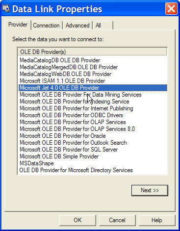 Providers tab select Microsoft Jet