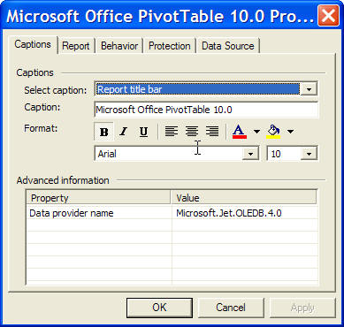 Microsoft Office PivotTable 10.0 Properties dialog box
