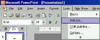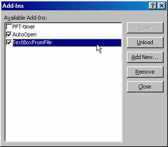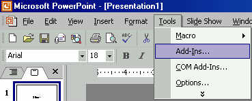 Step 3: In PowerPoint, use Tools | Add-Ins... | Add New... to locate and add the extracted file.  Ensure that it has a checkmark (or a 'X' in PP2000) to the left of the name.  If it doesn't, click the Load button.