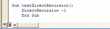 Sub DirectRecursion(x) '... If x < 0 Then DirectRecursion (-x) Else '... End If End Sub |