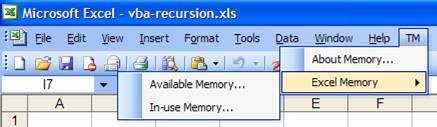 In all Office applications except Excel, the main menu bar is named Menu Bar. In Excel when a chart is the active object, the main menu bar is the Chart Menu Bar. In those instances when a worksheet component is the active object, the main menu bar is the Worksheet Menu Bar. So, if we wanted to add a new menu called TM, say to the right of the last existing item, Help, we would add a new command bar to the command bar named Worksheet Menu Bar. To do this we would add a command popup item to the parent command bar. Each popup contains a built-in command bar, which would now be available for our use. Then, if we wanted to add a sub-menu called, say, Excel Memory to the TM menu, we would embed a new command bar within the TM command bar – again by adding a popup item. This submenu would then have some menu items, such as ‘Available memory…” and ‘In use memory’ – see Figure 7. Effectively, we created a command bar (Excel Memory) in a command bar (TM) in a command bar (Worksheet Menu Bar). This should suggest to us that command bars constitute a recursive data structure – and we should explore a recursive routine to add and delete menu items.