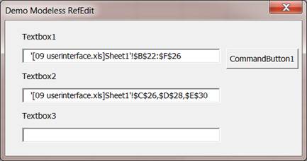 This completes our class module that is ready to drop into any add-in. The rest of this sub-section illustrates how to use the above class. Create a userform with three textboxes, TextBox1, TextBox2, TextBox3 and one commandbutton named CommandButton1. Name the userform demoModelessRefEdit and change its caption to Demo Modeless RefEdit