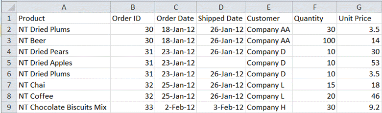 The table provides information about the status of each item in each order placed by customers. When a customer places an order, it is given a unique Order ID. Each product is uniquely identified by Product. If an order includes multiple products, there is one row in the table for each combination of Product & Order ID. For each order-product combination, the table tracks the order date (Order Date), the product ship date (Shipped Date), which will be empty if the product is not yet shipped, the customer name (Customer), the quantity ordered (Quantity), and the unit price (Unit Price).