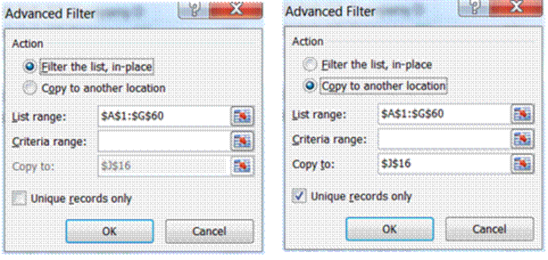 Use the choices under Action to either “Filter the list, in-place” (very much like what AutoFilter does) or to extract a Copy to another location of the selected data. I find the latter (i.e., copy to another location) to be the more useful feature since it leaves the original data untouched and all the rows remain visible. It also makes it possible to simultaneously view the results of different queries and to save the results of different queries for future review.