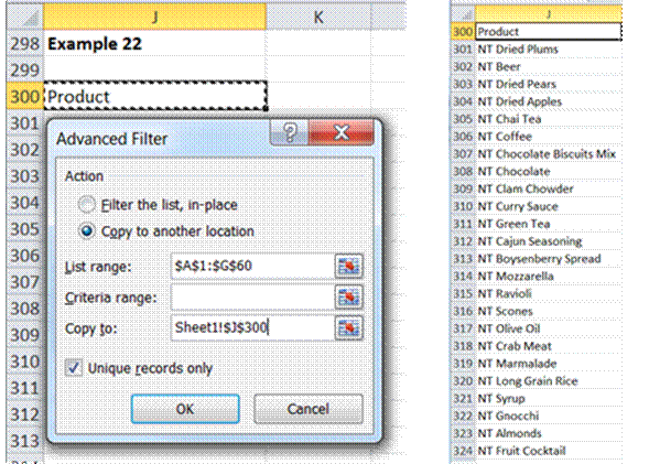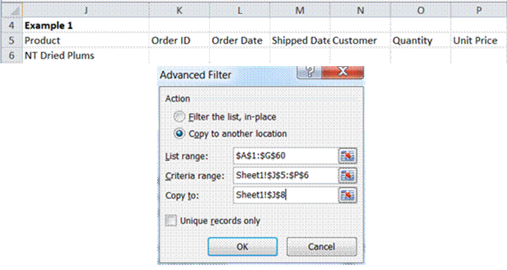 This requires specifying a single value for the Product column as shown in Figure 3. The dialog box also shows that the result will be copied to the range starting with J8.
