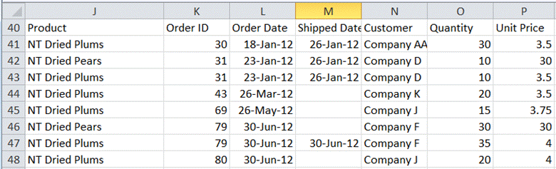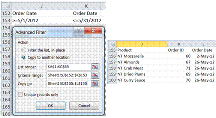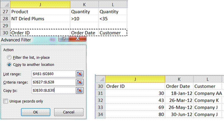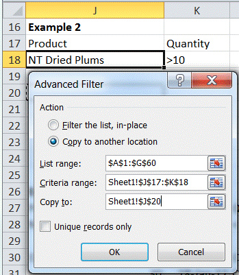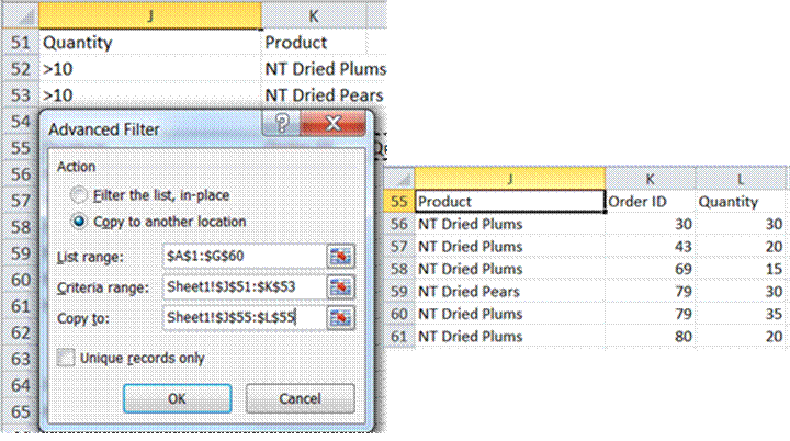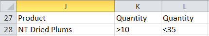 In this case, the conditions are Product=”NT Dried Plums” and Quantity > 30 and Quantity <=30. Remember that ANDed conditions have to be on the same row and there are two conditions that involve Quantity! Luckily, Advanced Filter allows columns to be duplicated as in Figure 7.