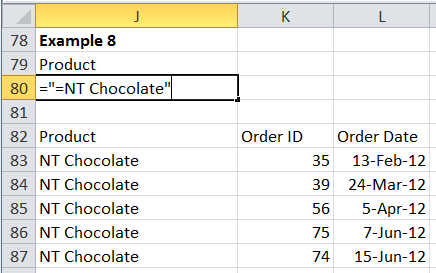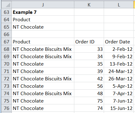 While previous searches also involved text fields what was not evident was that Excel actually matches values that start with the specified text. This becomes more obvious when the search is for “NT Chocolate,” which shows results for both NT Chocolate and NT Chocolate Biscuits Mix.