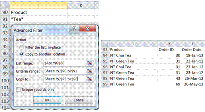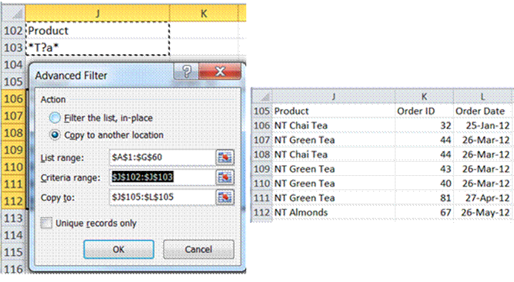 Tea related products are defined as having “tea” somewhere in the product name. Advanced Filter works with wildcard characters such as * and ?. To search for any occurrence of tea in the name of a product, use *tea*. [As in other context and other languages, the ? character allows a single character to be anything.]