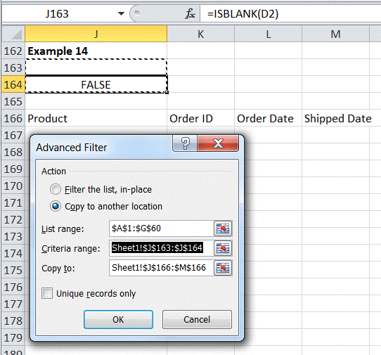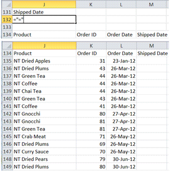 An unshipped product will have an empty Shipped Date. Adapt the earlier suggestion for finding an exact match (Example 11) except this time specify nothing in the search expression as in Figure 18. Also, to ensure a verifiable output, include the Shipped Date column. Obviously, it should contain only empty cells.