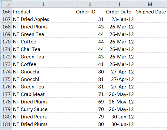 Before diving into the different ways Excel provides of filtering data we will look at the sample dataset that we will use for the rest of the chapter. The data set is a modified version of a table from the Northwind database that Microsoft has used for several years in its examples. The modifications to the data specifically make the already fairly rich dataset more useful in understanding Excel’s filter capabilities. Also, the modifications replace the long string “Northwind Traders” that starts every product name with the shorter “NT.” A sample of the first few rows of data together with all the column headers is in Figure 1.