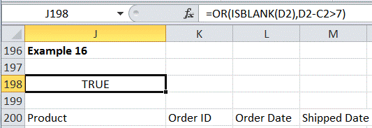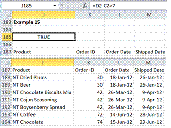 The condition requires checking if the difference between the product order date and shipped date is more than 7 days. [This specifically excludes unshipped orders.] Figure 21 shows both the criteria and the result.