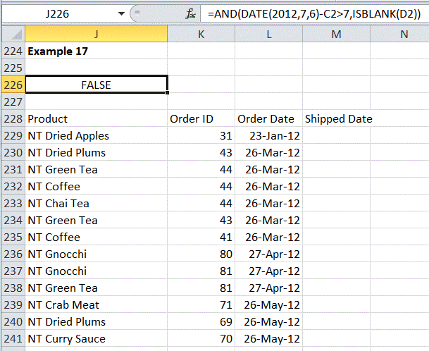This is similar to the previous example except that it involves an ‘and’ condition as well as a specific date in the formula (rather than comparing two dates that are already in the table). The formula and the associated result are in Figure 23. As should be expected the result should match Example 14 with the exception of the last 2 orders (order 79 and order 80), which were placed on June 30, 2012, i.e., 6 days before July 6, 2012.