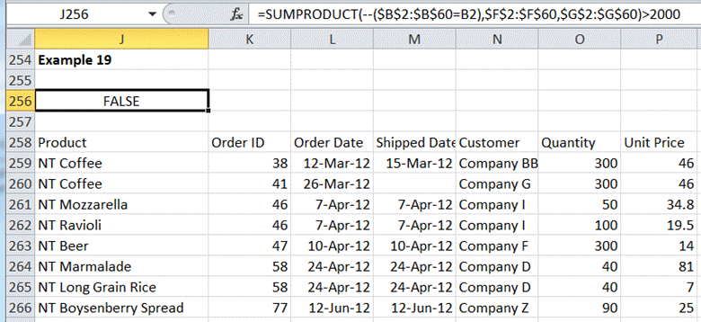 This is similar to the previous example except that now the decision is based on the entire order. An order that includes multiple products will have one row for each product in the source range. Consequently, the filter criteria must sum the revenue for each product in the order corresponding the each row. In the formula below, the first argument of the SUMPRODUCT is --($B$2:$B$60=B2). The part in parenthesis generates a list of 59 TRUE or FALSE values, one for each row in the source data, based on whether the row is part of the current order or not. The double minus signs convert the TRUE/FALSE values in 1/0 values. The other arguments to the SUMPRODUCT include the quantity and the unit price. Consequently, Excel will SUM the PRODUCT of the 1s or 0s with the quantity and the unit price. This will yield the total revenue for the current order.