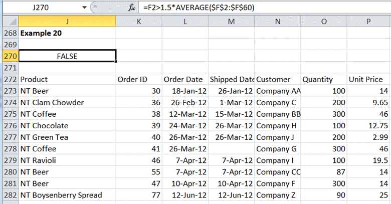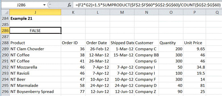 In this example, the comparison will be between each row of data and a statistical measure applied to the entire data set. What is required is to test whether the quantity is more than 1.5 * average quantity ordered per product. This translates to the formula and result in Figure 26.