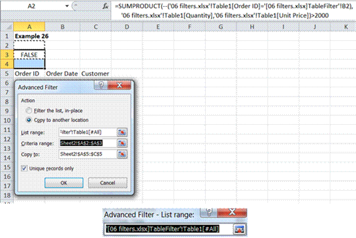 Working with the source list in another workbook is similar. Start with the destination worksheet in the destination workbook. The rest of the mechanics of creating the criteria formula and the references in the dialog box are the same. Obviously, the references are longer because, now, they also have to include the workbook name as in Figure 34.