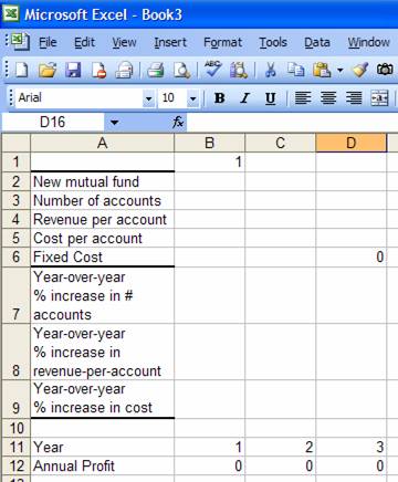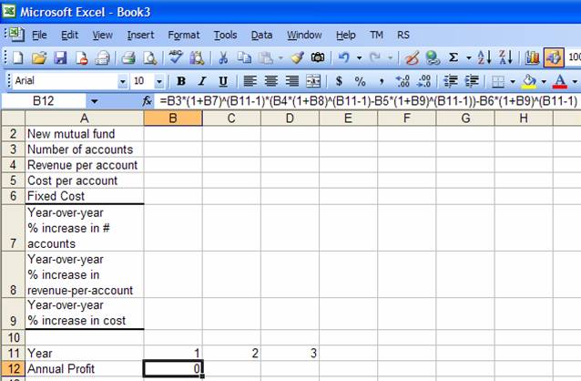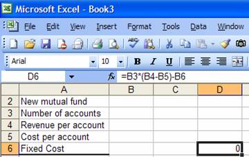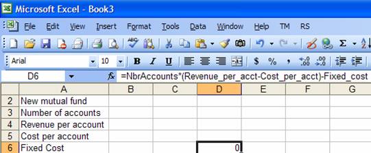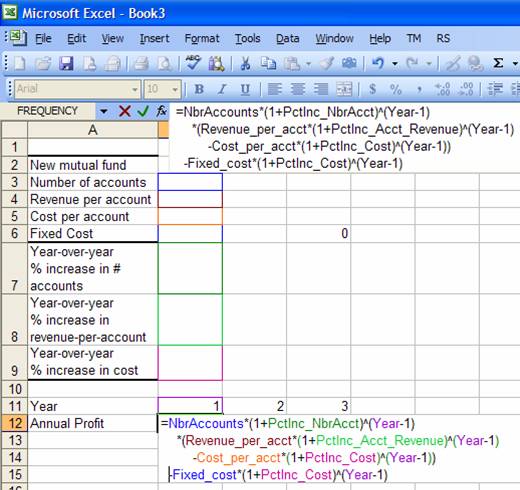 This is typically more than adequate for simple formulas. Even the formula below is relatively easy to understand. It calculates the annual profit of a new mutual fund taking into account the unit-profit, the number of accounts, and the fixed operating cost.
