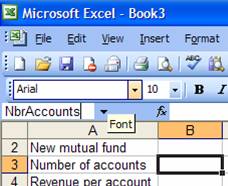 To name cell B3 as NbrAccounts, select the cell, then click in the Name Box, type the name and press the Enter key.