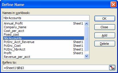 =NbrAccounts*(1+PctInc_NbrAcct)^(Year-1)*(Revenue_per_acct*(1+PctInc_Acct_Revenue)^(Year-1)-Cost_per_acct*(1+PctInc_Cost)^(Year-1))-Fixed_cost*(1+PctInc_Cost)^(Year-1) Named constantsIn addition to referring to a particular range, a name can also be just a constant. For example, if one plans to use the name of the company in several cells in different worksheets, it might make sense to create a named constant such as