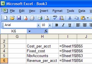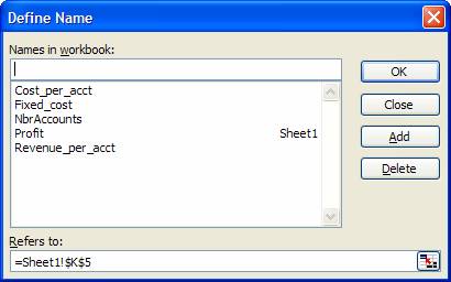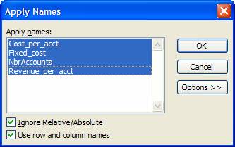 Name the cells B4, B5, and B6 as Revenue_per_acct, Cost_per_acct, and Fixed_Cost respectively. List the names and use names instead of cell referencesTo see the list of all names, select a cell in an otherwise empty range of the worksheet, then select Insert | Name > Paste… In the resulting dialog box, select Paste List.