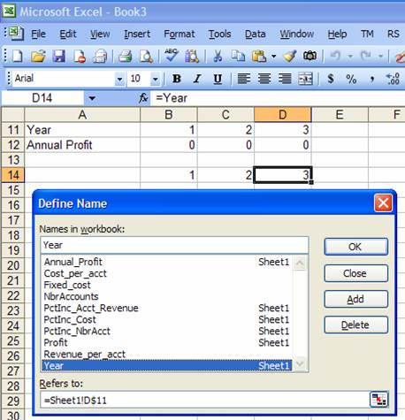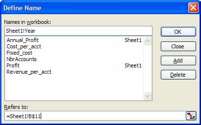 =NbrAccounts*(1+PctInc_NbrAcct)^(B$11-1)*(Revenue_per_acct*(1+PctInc_Acct_Revenue)^(B$11-1)-Cost_per_acct*(1+PctInc_Cost)^(B$11-1))-Fixed_cost*(1+PctInc_Cost)^(B$11-1) We can also replace the mixed reference to the year (B$11) with a name. First, select any cell in column B. Then, create a name using Insert | Name > Define… In the resulting dialog box, make sure the reference to the cell uses mixed-addressing as below.