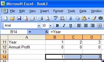 Excel remembers that we had selected a cell in column B when creating the name Year, which had a relative reference to column B. Hence, wherever we use the name Year, Excel will always interpret it to refer to the cell in the current-column row-11. We can test this quite easily. In some cell, say B14, enter the formula =Year. Copy B14 to C14:D14. The cells should show the values 1, 2, and 3 respectively.