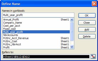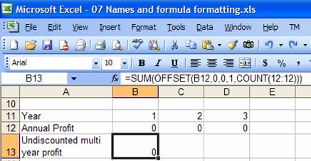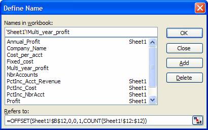 Of course, the next step is to improve the readability of the worksheet with a named formula. Suppose we were to replace the range reference in the name Multi_year_profit with the OFFSET formula. We would get: