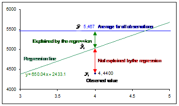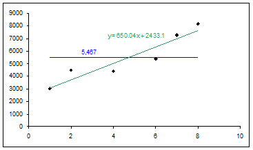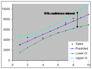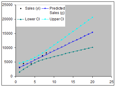 In addition to the trendline, Figure 2 also contains horizontal line showing the average of the sales data. From the trendline, we can conclude that on average monthly sales increase by 650 units each month. But, that is about the limit of the information. It is important to note that extrapolating too far out beyond the existing data set is not a very smart thing to do. It would be OK to estimate sales in each of the missing months: 3 and 5. Estimating for missing data within the overall data set is known as interpolation. By contrast, estimating sales for months outside the data set is known as extrapolation. It might be OK to make an estimate for “nearby” months such as month 9 or maybe even 10. However, it would be foolhardy to conclude that a year from now sales will have risen by 650*12 or 7,800 units. The limit of what one can do with a regression is further addressed in the section on Confidence Intervals.