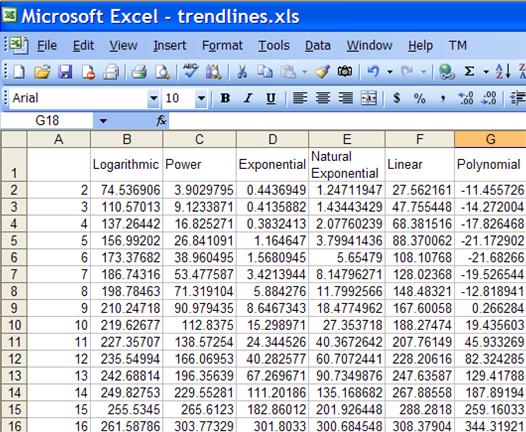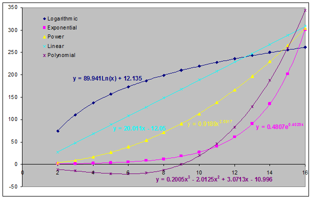The previous chart showed a linear trend with one independent variable. What other kinds of trends are there? Figure 3 shows five different types: polynomial of order 3, linear, logarithmic, natural exponential, and power.